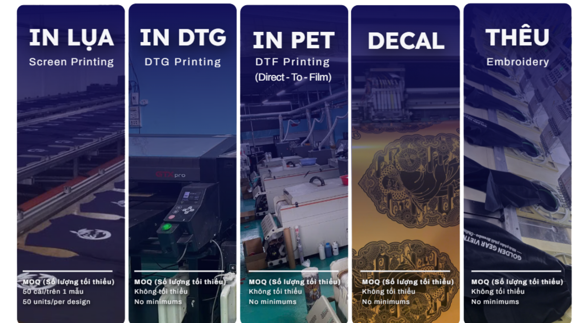 - 6 Công nghệ in ( In PET, In DTG, In Lụa, Decal, Thêu, In chuyển nhiệt)