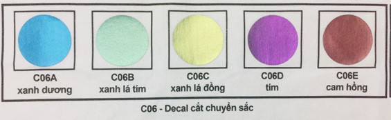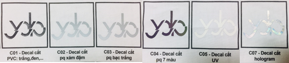 I03 – Decal in nhũ bạc: Được in trên lớp nhũ bạc. Do tính chất đặc thù của loại Decal nhũ bạc, màu sắc sẽ có phần hiển thị sai lệch vì bị ảnh hưởng của lớp nhũ bạc.